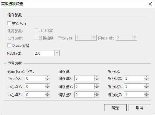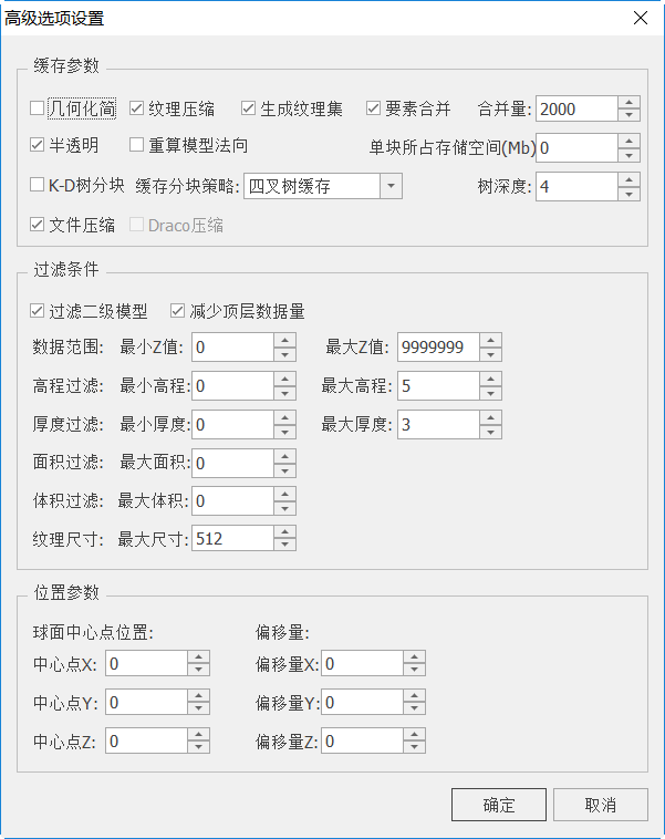 - 【高级选项】: 高级选项中包含的参数有 几何化简、纹理压缩、要素合并、合并量。