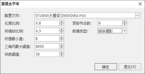 化简比例、顶级节点数、块缩放比例、纹理最小值、三角网最大阈值和块数阈值推荐使用系统默认参数。