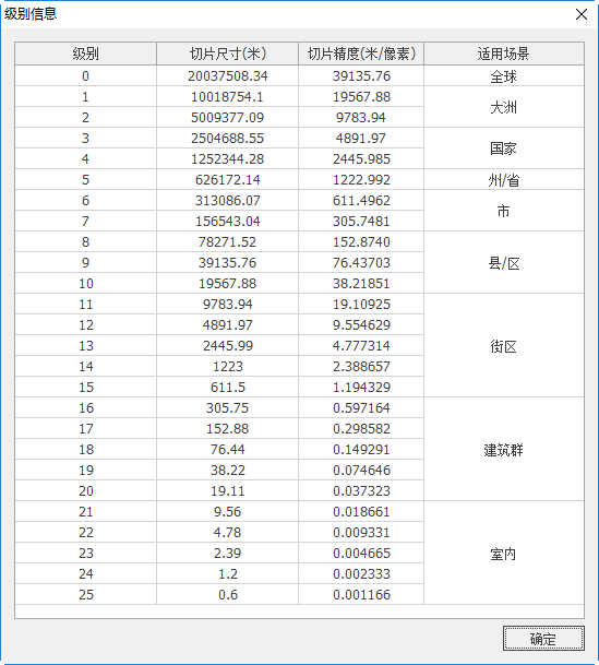 - 【分块策略】:生成M3D时,当数据量比较大时,建议采用分块策略创建LOD,保证视距较大时的高效浏览。分块策略包括四叉树和八叉树两种模式,对于城市景观等人工精模,更适用于四叉树分块策略。缓存级别则按照电子地图通用比例尺级别划分规则,具体切片尺寸及使用场景可参考下图: