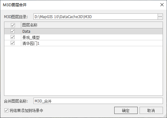 3. 输入合并图层的名称,选择是否勾选“将结果添加到场景中”,点击"确定"按钮,生成M3D合并图层。