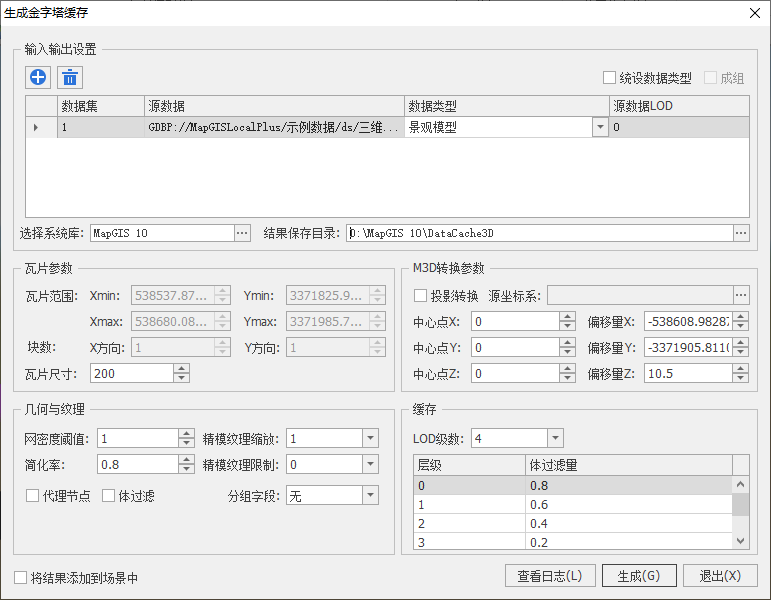8. 点击“生成”按钮,生成金字塔Region缓存和M3D缓存。用户也可以勾选“将结果添加到场景中”,生成的模型缓存文件将自动添加至新场景中。