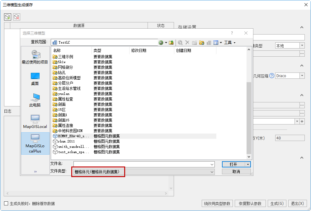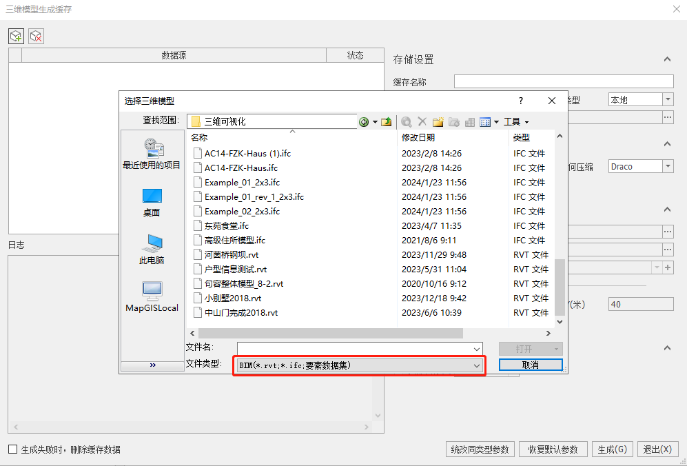 - 【数据类型】:系统提供景观模型、地质体模型和BIM模型三种数据类型。点击数据类型项右侧的下拉框,可选择生成缓存的数据类型。
