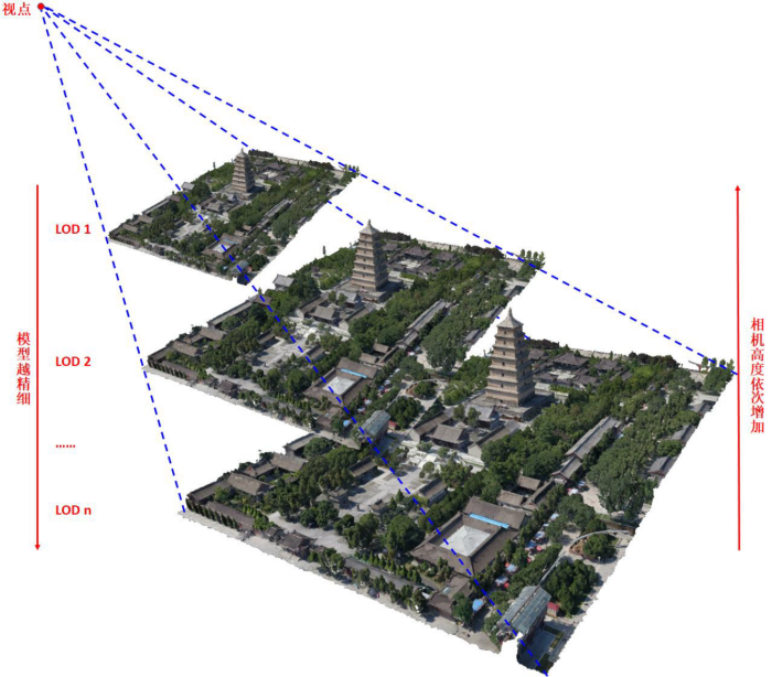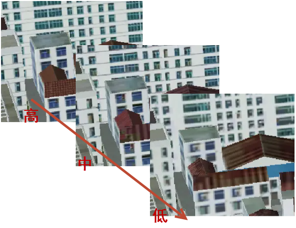 因此,M3D数据存储时,采用了LOD分层数据模式,对3D数据构建不同精细程度的LOD缓存,当相机高度越小,会调用显示LOD值越大的M3D数据,显示越精细。