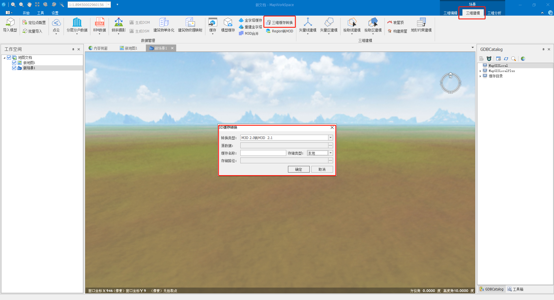 1. 在场景视图中进入"三维建模",启动"三维缓存转换"功能: