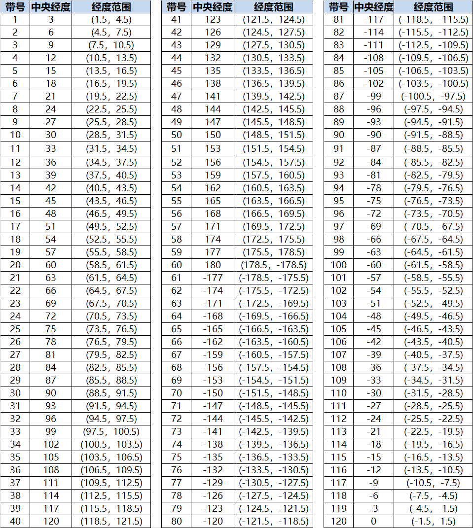 高斯投影3度分带得到的中央经度和投影区带号的列表: