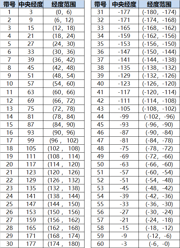 高斯投影6度分带得到的中央经度和投影区带号的列表: