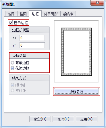 制作好的花边,可以应用在打印输出中,使用时,在排版框或其它整饰元素的属性中设置花边样式,如下图进行设置后,点击“边框参数”便可在“样式选择器”中选择要使用的边框样式。
