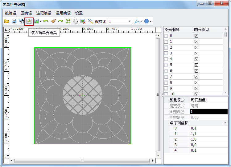 2、使用工具条上的“装入简单要素类”,将制作好的花边符号图层导入系统库,并调整图元的颜色、笔宽等参数;