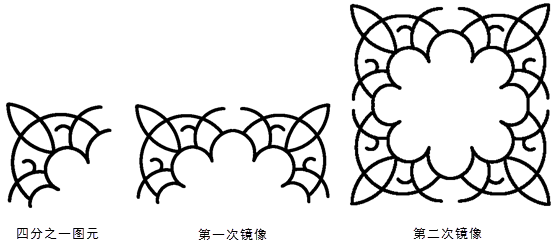 具有对称规律的花边符号,只需绘制出一部分图元,再使用图元镜像,就可以方便地生成整个图元,因此,在绘制前,需要确定一种最简单的绘制方法。例如样式12,只用画出四分之一图元,再使用两次镜像即可。