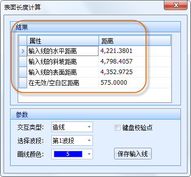- 【输入线的表面距离】:输入线在三维表面的实际距离,即下图标注①;