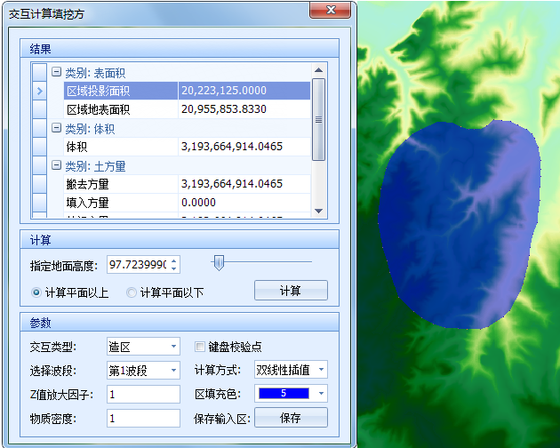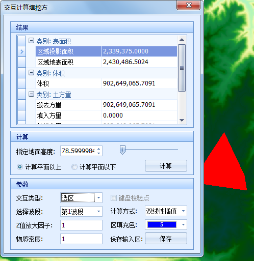 交互式蓄积量计算是通过用户手动输入或选择Grid数据的某片区数据,按照一定插值计算方式,计算相应区域的表面积、体积、土方量。