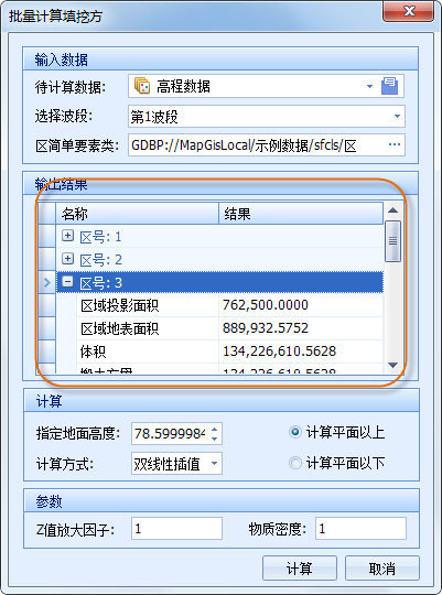 批量计算可以同时对多个区域进行批量的表面积、体积以及土方量的计算。