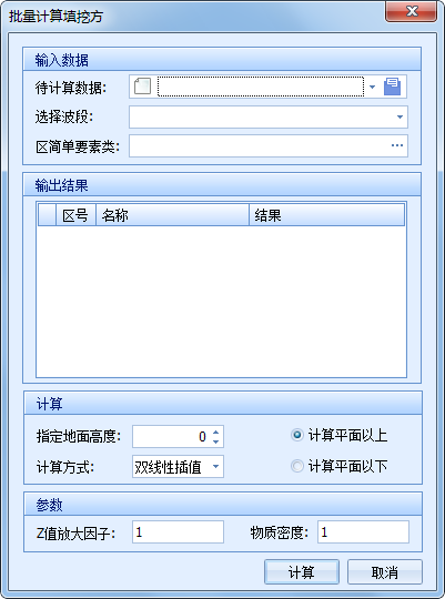 1. 在“DEM分析”菜单的下拉菜单中点击“地表计算”→“批量计算填挖方”,弹出批量计算对话框,如下图所示: