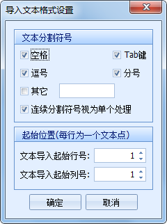 - 【原始数据点文件】:原始数据点文件是一个用户创建的文本文件,在其中输入若干原始点的信息,依次为X的值,Y的值和Z的值。点击“导入文本格式…”可以设置该文件的格式: