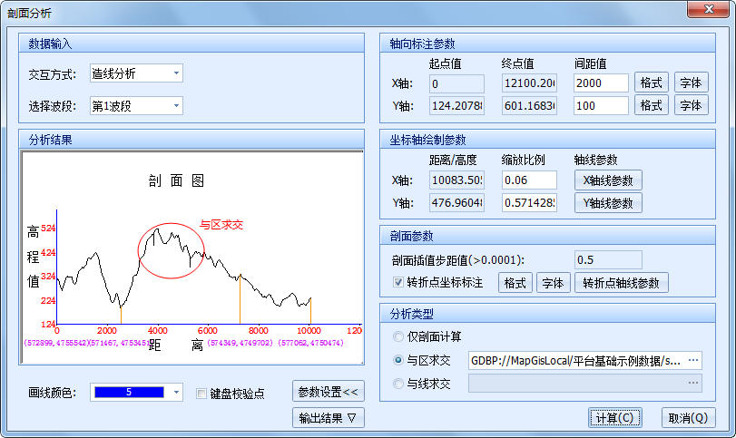 3. 点击参数设置,可展开对话框。用于设置剖面视图的参数(如下图),设置完成后点击“计算”按钮即可查看效果: