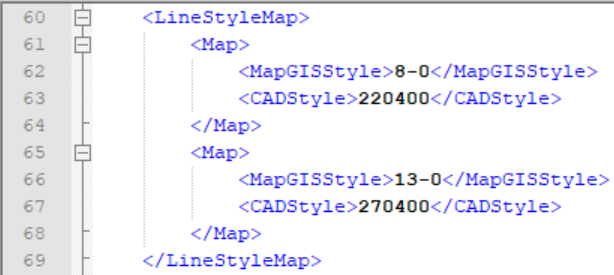 在CAD导出配置文件中,<LineStyleMap>部分信息记录了MapGIS和CAD的线符号转换关系。如下图所示:
