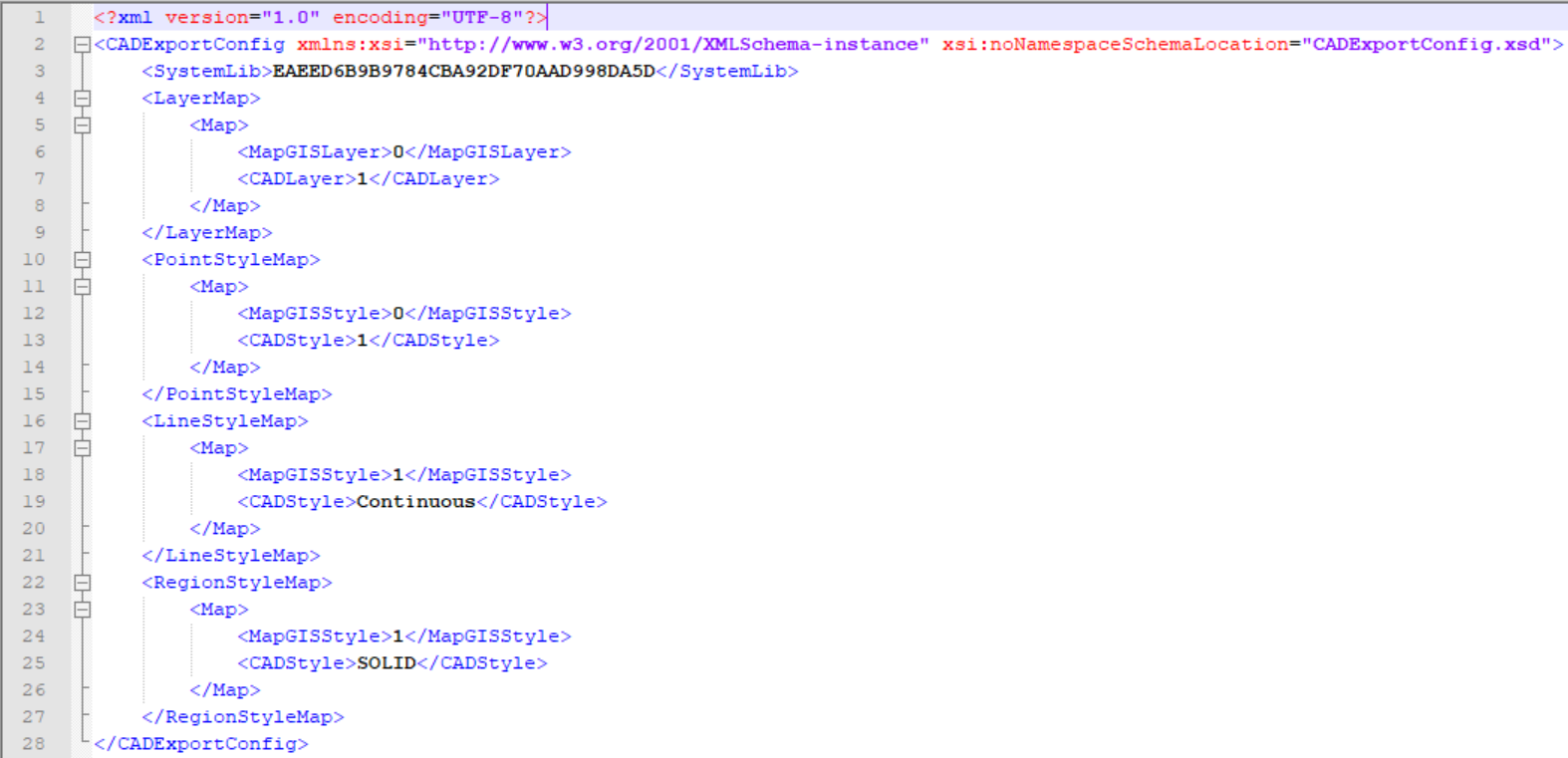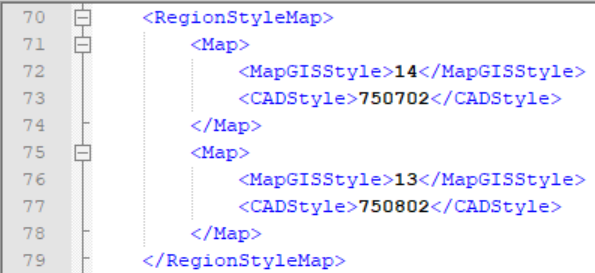 在CAD导出配置文件中,<RegionStyleMap>部分信息记录了MapGIS和CAD的区符号转换关系。如下图所示: