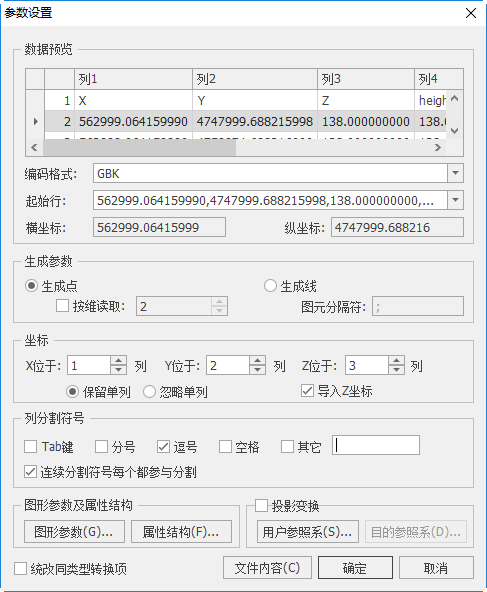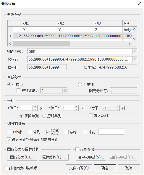 - 【导入z坐标】当读取维度为3时,勾选“导入z坐标”,可设置Z值所在列。
