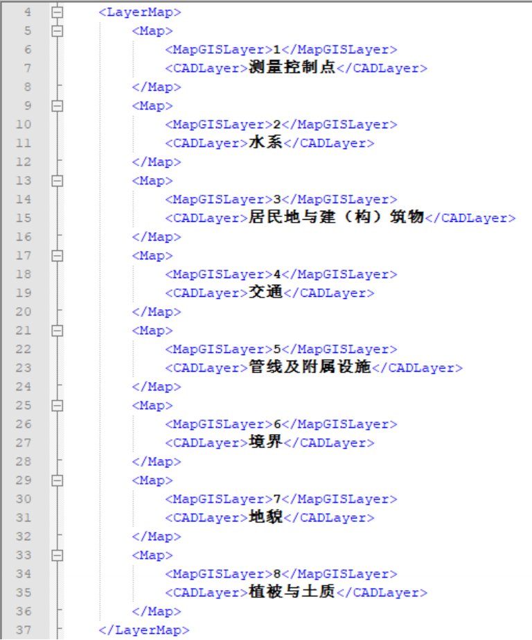 在CAD导出配置文件中,<LayerMap>部分信息记录了MapGIS和CAD的层转换关系。如下图所示: