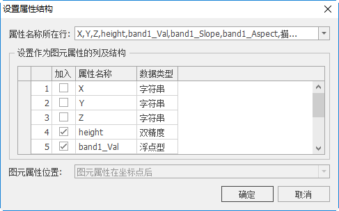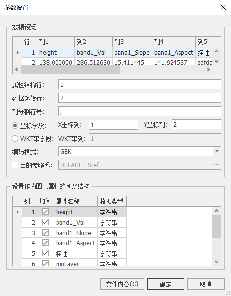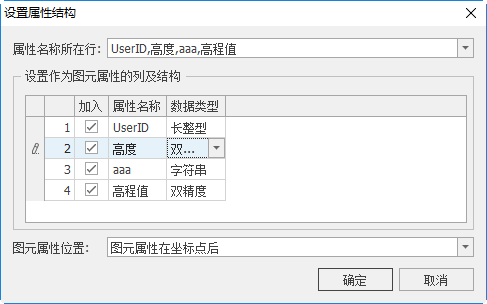 - 【设置作为图元属性的列及结构】:选择部分或所有列作为属性,并可设置属性字段的类型。
