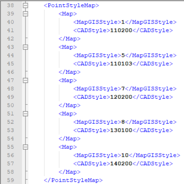 在CAD导出配置文件中,<PointStyleMap>部分信息记录了MapGIS和CAD的点符号转换关系。如下图所示: