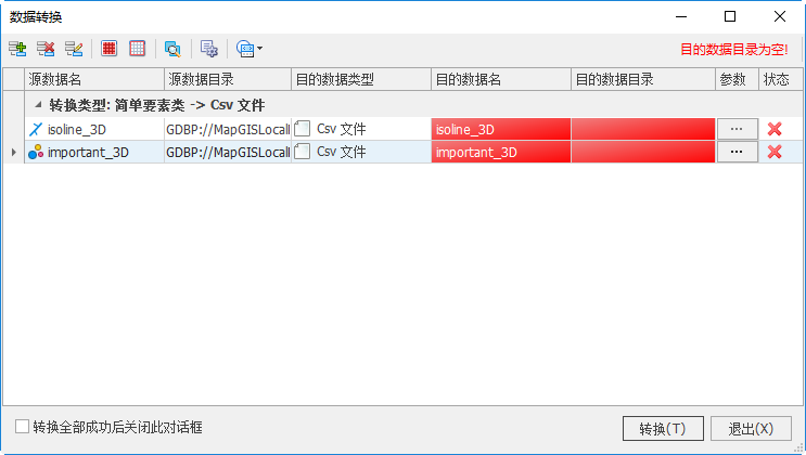 csv数据转换时目的数据名是目标MapGIS GDB数据库名称,不可修改。