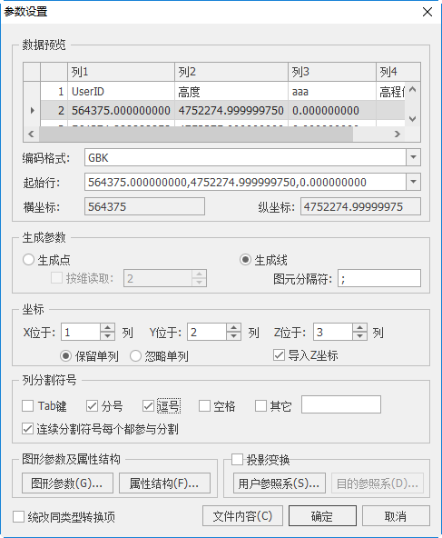 导入*.txt数据时,其操作步骤同“shp数据”,下面只对数据转换的参数设置进行说明。导入*.txt数据时,其高级参数设置界面如下所示: