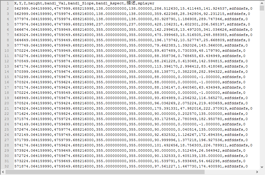 下图为一个本身为点图层的TXT文本文件,数据共9列,其中前三列为点的X/Y/Z坐标,后七列为点图层的属性,列之间用逗号隔开,且数据第一行为属性字段名称。