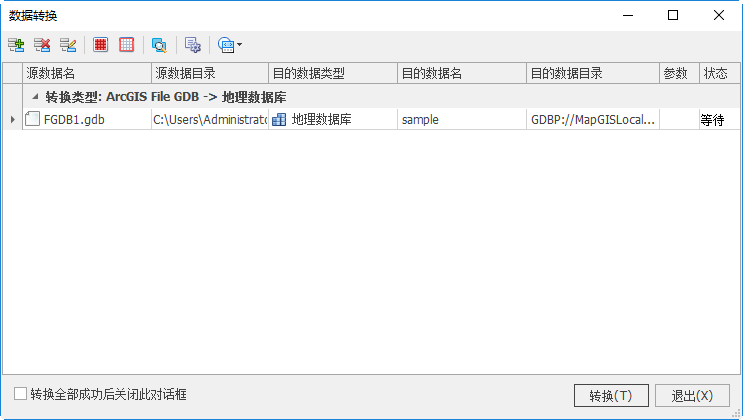 3. 点击"转换",可将整个ArcGIS File GDB或ArcGIS Personal GDB导入到MapGIS GDB中。