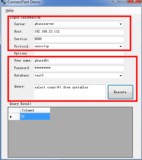5. 打开“ConnectTest Demo”,依次输入下列红框中的参数,点击“Execute”,如果灰色区域查询出结果,则连接成功。