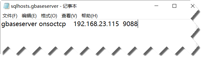 4. 在客户端安装目录的etc文件夹(如C:\Program Files\GBase Client-SDK\etc\)下,新建配置文件sqlhosts.gbaseserver,输入以下内容: