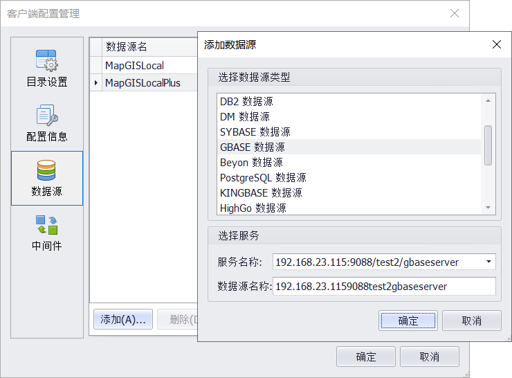 在客户机上安装配置GBase客户端,并安装MapGIS后,可在MapGIS中配置GBase数据源,用来管理GBase数据库。