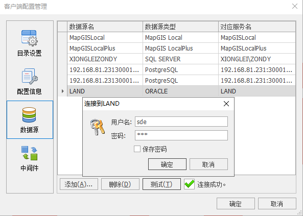 3. "确定"后,客户端配置管理界面,支持测试连接 Oracle 数据源,需输入用户名密码信息。测试成功后可继续下一步 "确定"。