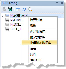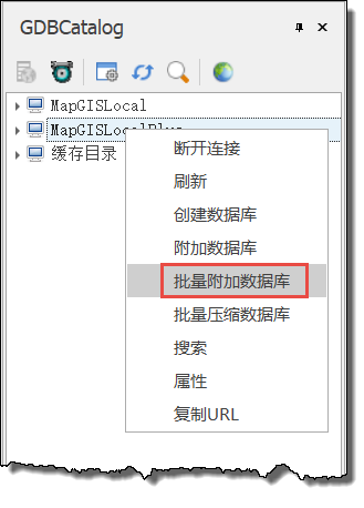 1. 在MapGISLocal节点上右击,选择“批量附加数据库”。