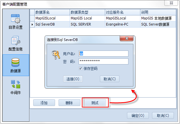 - 【测试】:添加数据源后,用于测试客户端与SDE数据源是否可以正确连接。