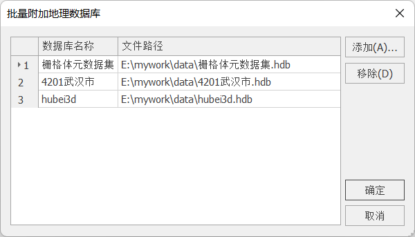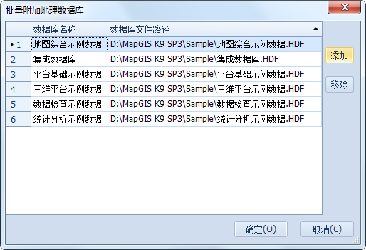 2. 在“批量附加地理数据库”对话框中,单击“添加”按钮,添加要附加的地理数据库文件。可以通过“移除”按钮移出不需要附加的地理数据库。
