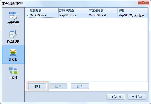 - 【添加】:用于将各类SDE以及中间件的数据源添加到MapGIS GDBCatalog目录树上。