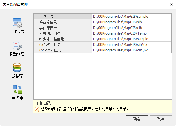 “目录设置”页面中记录了MapGIS常用工作目录路径,默认为安装路径下。