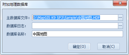 2. 在弹出的对话框中选择数据库所存放的路径;如果有“数据库日志”文件,则将日志文件添加进来,如果没有可忽略此项;“数据库名称”,用于显示在MapGIS GDBCatalog目录树上,可作为别名来考虑。