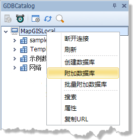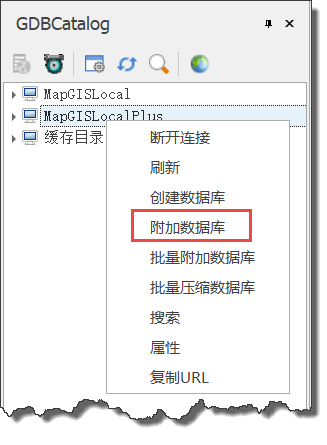 1. 在MapGISLocal节点上右击,选择“附加数据库”;