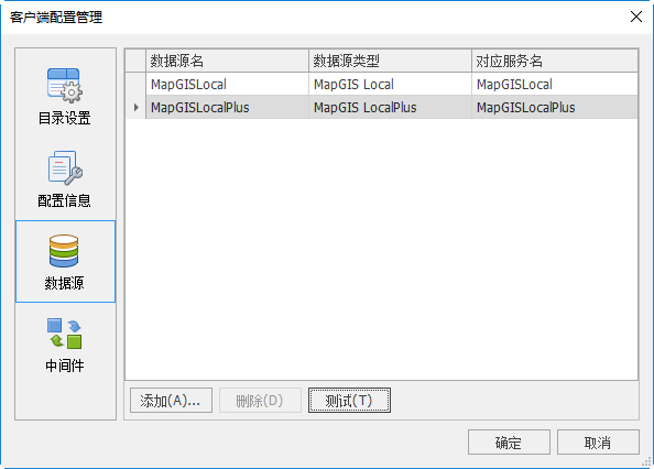 “数据源”页面下只默认列出了本地数据源MapGISLocal/MapGISLocalPlus。本地数据源MapGISLocal/MapGISLocalPlus是系统默认数据源,用于和本地HDF/HDB地理数据库建立连接,该数据源不可更改或删除。