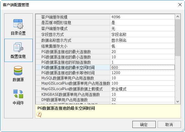 PG数据源连接池的最长空闲时间:当MapGIS程序不执行访问PostgreSQL数据库访问相关操作,可认为此时处于空闲时间。设置最长空闲时间,有利于及时释放PostgreSQL数据库的连接数资源。