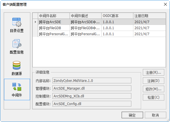 “中间件”页面中显示了已注册的中间件信息,默认情况下注册了“跨平台ArcSDE”、“跨平台FileGDB”、“跨平台PersonalGDB”三种中间件,具体使用方法可参考“矢量数据中间件”。