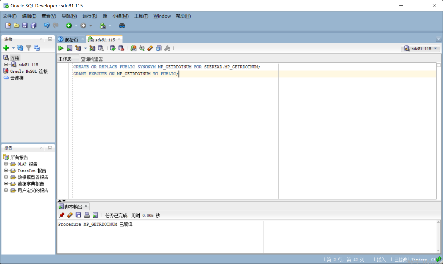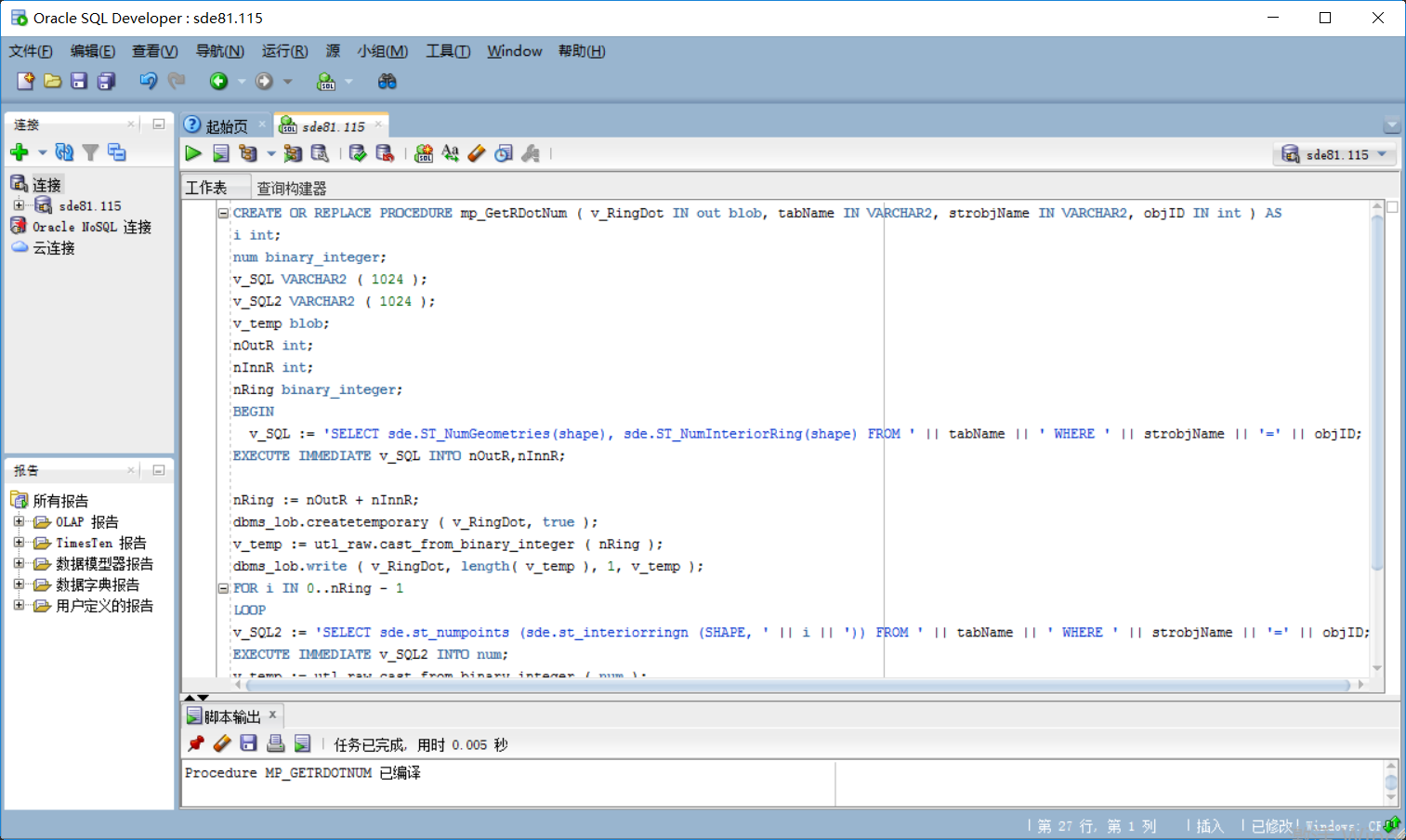 用户可通过PL/SQL等开发工具创建存储过程,下面以Oracle自带的SQL Developer工具为例,讲解存储过程mp_GetRDotNum的创建方法。