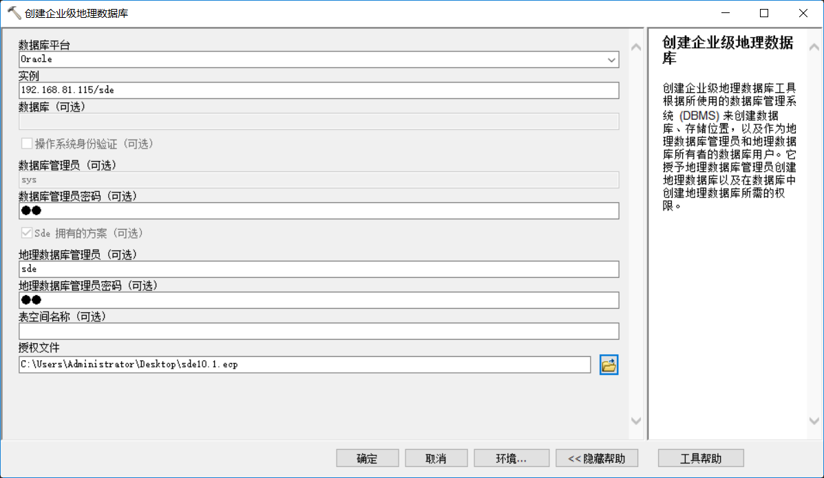 2. 点击"确定"后,可在Oracle服务器端中创建ArcGIS Oracle数据库;