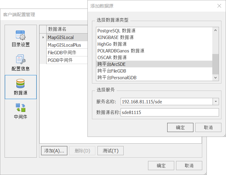 2. 切换到【数据源】页面,点击"添加",选择“跨平台ARCSDE”,服务名称为ArcGIS Oracle数据库信息,格式为“Oracle服务器IP/实例名”。