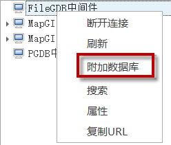 4. 在数据源节点,右键启动【附加数据库】,可关联本地数据库文件。成功后即可将ArcGIS的FileGDB或PersonalGDB添加为数据库节点。