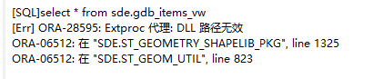 select * from sde.gdb_items_vw;如果提示执行失败提示如下错误,则是因为 sde的ST_SHAPELIB.dll 文件路径没有配置或者配置不正确,否则如果执行成功代表外部代理配置成功。