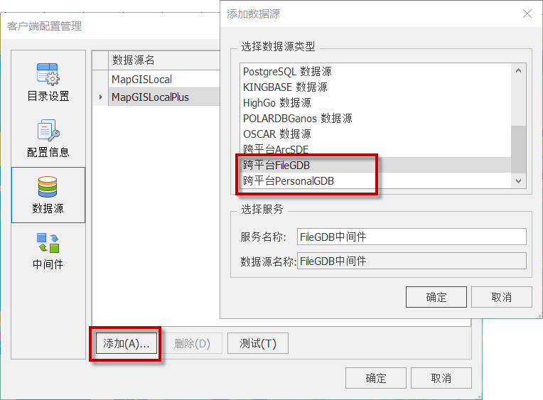 2. 切换到【数据源】页面,点击"添加",选择“跨平台FileGDB”或“跨平台PersonalGDB”,"确定"后,添加数据源;