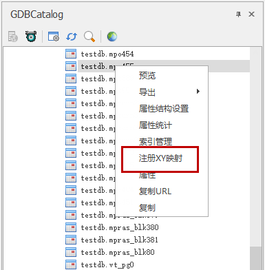 1. 选择PostgreSQL中间件数据源的对象类,右键启动"注册XY映射"功能: